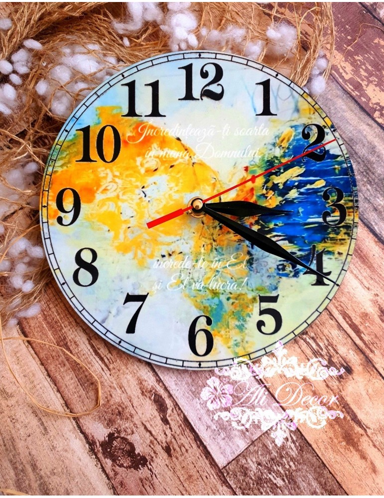Un ceas de perete este unul dintre cele mai privite obiecte pe care cineva le observa atat in casa cat si la birou. Poate fi unul dintre cele mai utile si unice cadouri, de aceea noi iti oferim si posibilitatea de a-ti personaliza ceasul cu orice imagine si text dorit. Ceasul este din MDF si personalizat prin tehnologie de imprimare: sublimare.