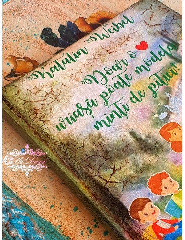 La Alidecor, fiecare agendă este personalizată manual cu grijă, folosind tehnica decoupage-ului, antichizate cu lac de crapare si patine, utilizand materiale profesionale pe bază de apă – sigure, durabile și prietenoase cu mediul. Coperta este sigilată cu lac protector non-toxic, astfel încât designul ales să reziste în timp, chiar și la utilizare zilnică.