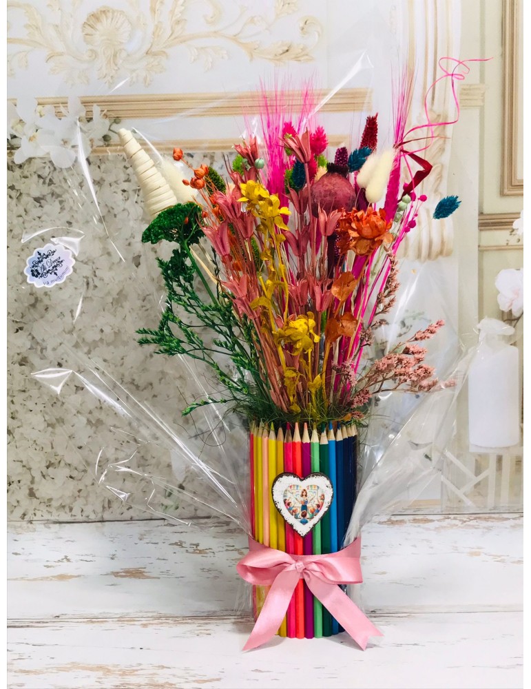 Material: creioane colorate din lemn, flori uscate, stabilizate