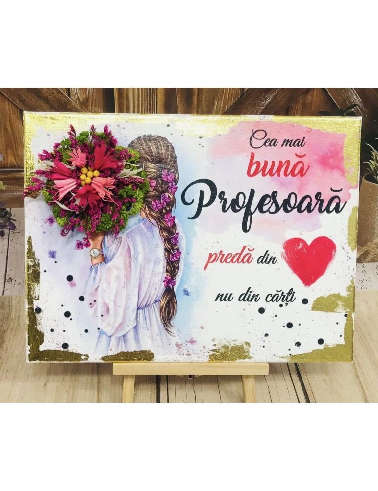 Ofera cadouri personalizate pentru cadrele didactice! Descopera daruri unice pentru profesoare, educatoare, diriginte si invatatoare, create special pentru a reflecta respectul si aprecierea pentru educatie. Un tablou este unul dintre cele mai privite obiecte, usor de observat in orice locatie, iar un tablou canvas personalizat manual, decorat cu flori uscate,va fi un cadou unic si plin de culoare. Tabloul este lucrat manual prin tehnica decoupage si tehnici complementare, cu hartie de matase de cea mai mica densitate (12g), vopsele acrilice si lacuri pe baza de apa, non-toxice (Voc Low si Apeo Free), marca Maxi Decor. Este accesorizat cu foita de aur pentru pictura si flori uscate si stabilizate, aducand un strop de natura si de eleganta in orice spatiu. Pe baza specificatiilor lasate de tine, ne rezervam dreptul sa ajustam grafica astfel incat tu sa primesti un produs unic. Daca doresti o tema care nu este disponibila, ne-o poti comunica - lasa-ti ideile in mainile noastre si nu vei regreta. Asigura-te ca ai completat toate detaliile necesare pentru a putea plasa comanda. Verificati ca mesajele sa fie scrise corect si cu diacritice, daca asa va doriti sa apara. Vom folosi intocmai textele trimise de dvs. Culorile pot diferi fata de varianta reala, in functie de setarile monitorului / device-ului dvs., luminozitate, contrast, culoare. Ambalarea se face in cutie cadou.