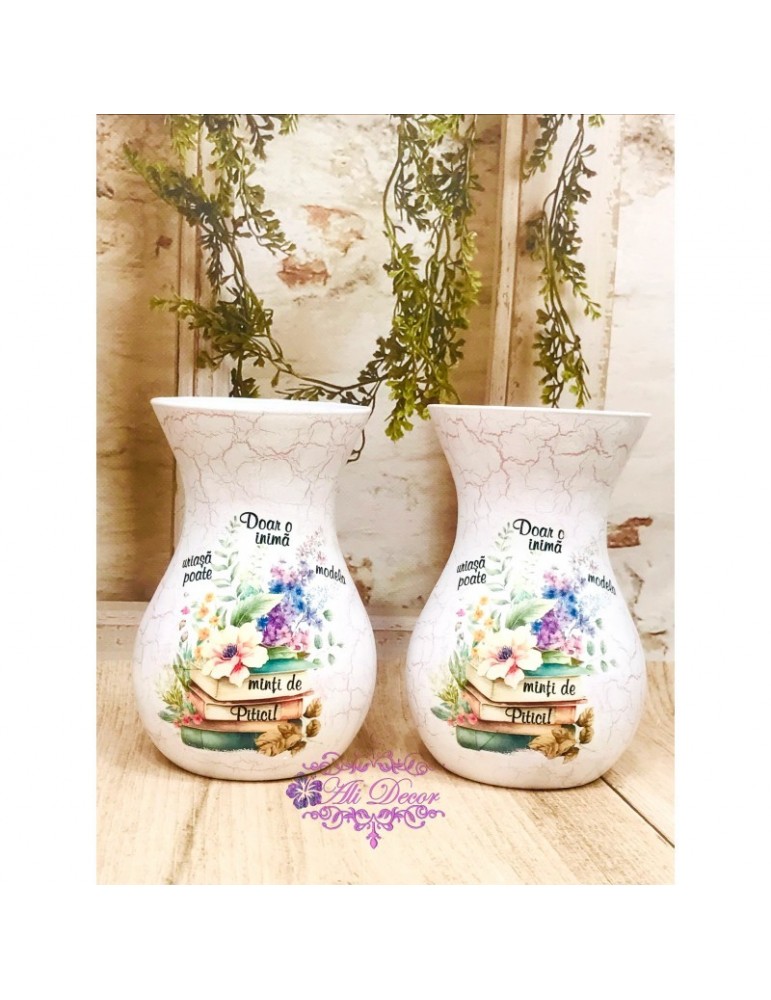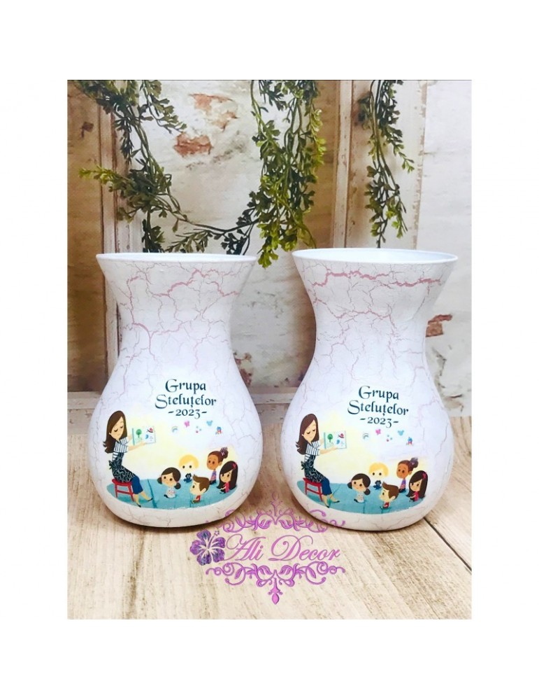 Ofera cadouri personalizate pentru cadrele didactice! Descopera daruri unice pentru profesoare, educatoare, diriginte si invatatoare, create special pentru a reflecta respectul si aprecierea pentru educatie. Flori, fete si baieti...in alegerea unui buchet de flori, alegerea iti apartine. Dar ce ar fi daca atunci cand daruiesti un buchet de flori ai oferi si o vaza personalizata? Surpiza va fi dubla in acesta caz :) Este infrumusetata prin tehnica decoupage-ului,cu hartie de matase de cea mai mica densitate (12g), vopsita si decorata manual,antichizata cu lac de crapare si patine, protejata cu lac pentru o rezistenta foarte buna in timp. Produsele folosite pentru decorare sunt produse profesionale,pe baza de apa, baby-friendly, certificate ecologic, non-Toxice, marca Maxi Decor (Voc Low & Apeo Free). Pe baza specificatiilor lasate de tine, ne rezervam dreptul sa ajustam grafica astfel incat tu sa primesti un produs unic. Vaza este din sticla si se recomanda manipularea cu grija pentru a nu se sparge sau deteriora. Daca doresti o tema care nu este disponibila, ne-o poti comunica - lasa-ti ideile in mainile noastre si nu vei regreta. Asigura-te ca ai completat toate detaliile necesare pentru a putea plasa comanda. Verificati ca mesajele sa fie scrise corect si cu diacritice, daca asa va doriti sa apara. Vom folosi intocmai textele trimise de dvs. Culorile pot diferi fata de varianta reala, in functie de setarile monitorului / device-ului dvs., luminozitate, contrast, culoare. Forma vazei poate diferi in functie de stocul disponibil la furnizor. Pretul este pentru o singura vaza.