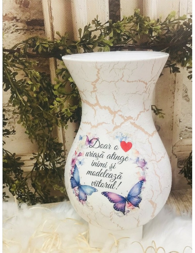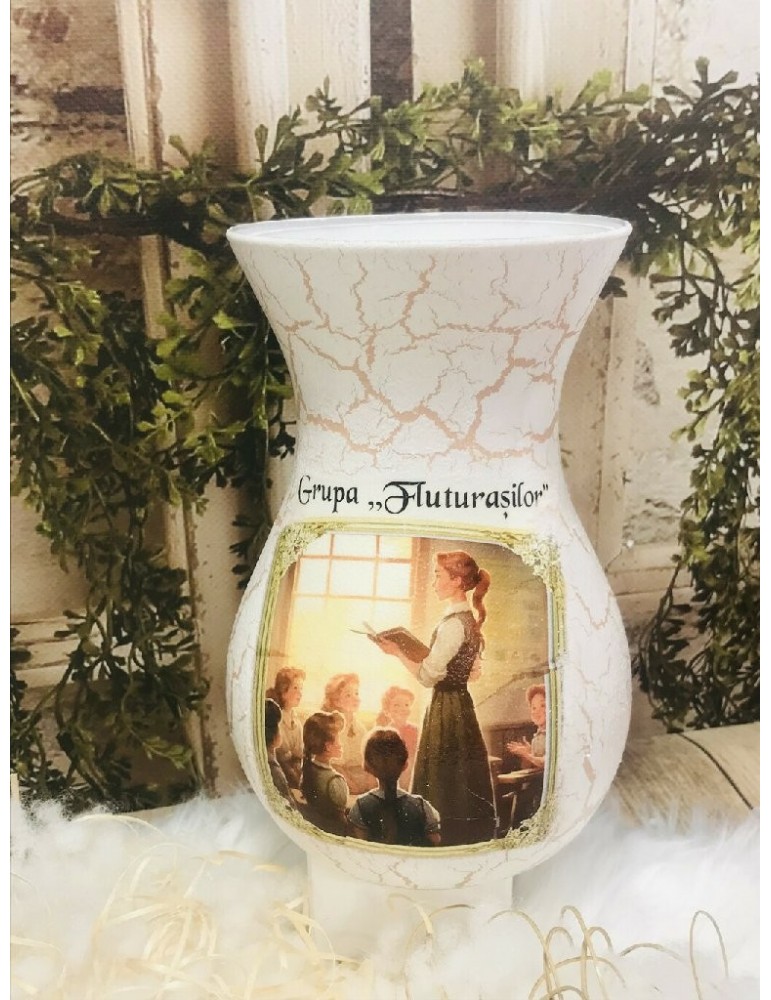 Ofera cadouri personalizate pentru cadrele didactice! Descopera daruri unice pentru profesoare, educatoare, diriginte si invatatoare, create special pentru a reflecta respectul si aprecierea pentru educatie. Flori, fete si baieti...in alegerea unui buchet de flori, alegerea iti apartine. Dar ce ar fi daca atunci cand daruiesti un buchet de flori ai oferi si o vaza personalizata? Surpiza va fi dubla in acesta caz :) Este infrumusetata prin tehnica decoupage-ului,cu hartie de matase de cea mai mica densitate (12g), vopsita si decorata manual,antichizata cu lac de crapare si patine, protejata cu lac pentru o rezistenta foarte buna in timp. Produsele folosite pentru decorare sunt produse profesionale,pe baza de apa, baby-friendly, certificate ecologic, non-Toxice, marca Maxi Decor (Voc Low & Apeo Free). Pe baza specificatiilor lasate de tine, ne rezervam dreptul sa ajustam grafica astfel incat tu sa primesti un produs unic. Vaza este din sticla si se recomanda manipularea cu grija pentru a nu se sparge sau deteriora. Daca doresti o tema care nu este disponibila, ne-o poti comunica - lasa-ti ideile in mainile noastre si nu vei regreta. Asigura-te ca ai completat toate detaliile necesare pentru a putea plasa comanda. Verificati ca mesajele sa fie scrise corect si cu diacritice, daca asa va doriti sa apara. Vom folosi intocmai textele trimise de dvs. Culorile pot diferi fata de varianta reala, in functie de setarile monitorului / device-ului dvs., luminozitate, contrast, culoare. Forma vazei poate diferi in functie de stocul disponibil la furnizor.
