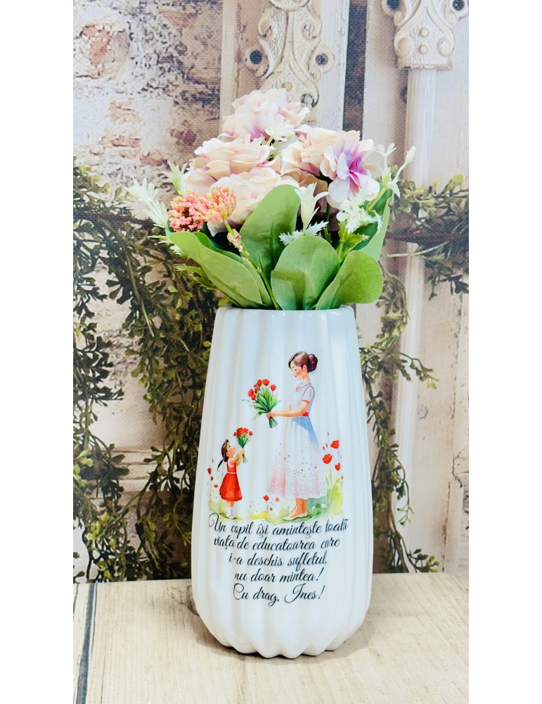 Ofera cadouri personalizate pentru cadrele didactice! Descopera daruri unice pentru profesoare, educatoare, diriginte si invatatoare, create special pentru a reflecta respectul si aprecierea pentru educatie. Flori, fete si baieti...in alegerea unui buchet de flori, alegerea iti apartine. Dar ce ar fi daca atunci cand daruiesti un buchet de flori ai oferi si o vaza personalizata? Surpiza va fi dubla in acesta caz :) Este infrumusetata prin tehnica decoupage-ului,cu hartie de matase de cea mai mica densitate (12g), vopsita  partial si decorata manualprotejata cu lac pentru o rezistenta foarte buna in timp. Produsele folosite pentru decorare sunt produse profesionale,pe baza de apa, baby-friendly, certificate ecologic, non-Toxice, marca Maxi Decor (Voc Low & Apeo Free)Pe baza specificatiilor lasate de tine, ne rezervam dreptul sa ajustam grafica astfel incat tu sa primesti un produs unic. Vaza este din sticla si se recomanda manipularea cu grija pentru a nu se sparge sau deteriora. Daca doresti o tema care nu este disponibila, ne-o poti comunica - lasa-ti ideile in mainile noastre si nu vei regreta. Asigura-te ca ai completat toate detaliile necesare pentru a putea plasa comanda. Verificati ca mesajele sa fie scrise corect si cu diacritice, daca asa va doriti sa apara. Vom folosi intocmai textele trimise de dvs. Culorile pot diferi  fata de varianta reala, in functie de setarile monitorului / device-ului dvs., luminozitate, contrast, culoare.