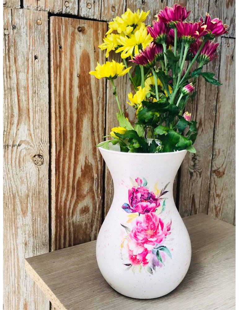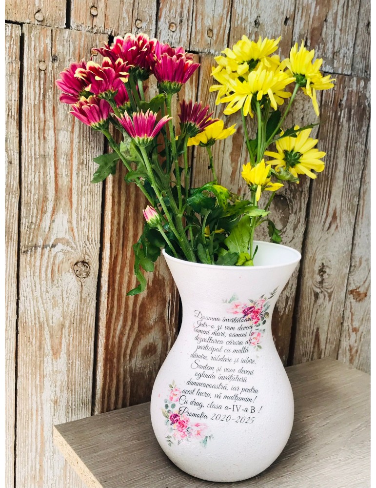 Ofera cadouri personalizate pentru cadrele didactice! Descopera daruri unice pentru profesoare, educatoare, diriginte si invatatoare, create special pentru a reflecta respectul si aprecierea pentru educatie. Flori, fete si baieti...in alegerea unui buchet de flori, alegerea iti apartine. Dar ce ar fi daca atunci cand daruiesti un buchet de flori ai oferi si o vaza personalizata? Surpiza va fi dubla in acesta caz :) Este infrumusetata prin tehnica decoupage-ului,cu hartie de matase de cea mai mica densitate (12g), vopsita si decorata manual, protejata cu lac pentru o rezistenta foarte buna in timp. Produsele folosite pentru decorare sunt produse profesionale,pe baza de apa, baby-friendly, certificate ecologic, non-Toxice, marca Maxi Decor (Voc Low & Apeo Free). Pe baza specificatiilor lasate de tine, ne rezervam dreptul sa ajustam grafica astfel incat tu sa primesti un produs unic. Vaza este din sticla si se recomanda manipularea cu grija pentru a nu se sparge sau deteriora. Daca doresti o tema care nu este disponibila, ne-o poti comunica - lasa-ti ideile in mainile noastre si nu vei regreta. Asigura-te ca ai completat toate detaliile necesare pentru a putea plasa comanda. Verificati ca mesajele sa fie scrise corect si cu diacritice, daca asa va doriti sa apara. Vom folosi intocmai textele trimise de dvs. Culorile pot diferi fata de varianta reala, in functie de setarile monitorului / device-ului dvs., luminozitate, contrast, culoare. Forma vazei poate diferi in functie de stocul disponibil la furnizor. Pretul estepentru o singura vaza.