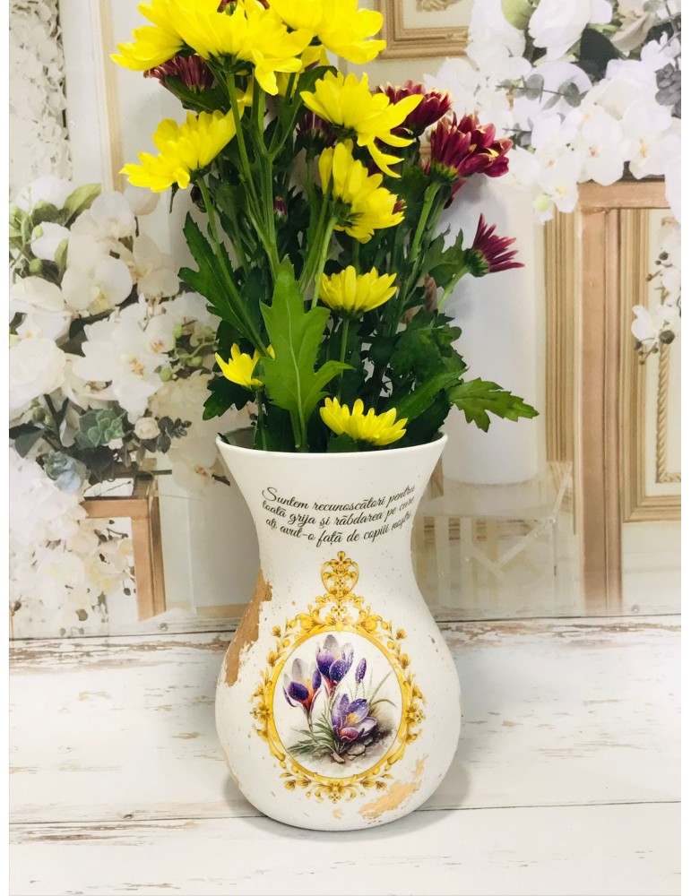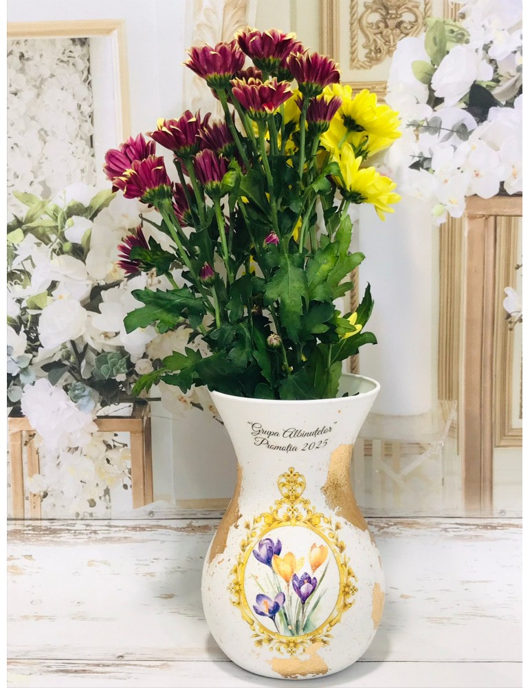 Ofera cadouri personalizate pentru cadrele didactice! Descopera daruri unice pentru profesoare, educatoare, diriginte si invatatoare, create special pentru a reflecta respectul si aprecierea pentru educatie. Flori, fete si baieti...in alegerea unui buchet de flori, alegerea iti apartine. Dar ce ar fi daca atunci cand daruiesti un buchet de flori ai oferi si o vaza personalizata? Surpiza va fi dubla in acesta caz :) Este infrumusetata prin tehnica decoupage-ului,cu hartie de matase de cea mai mica densitate (12g), vopsita si decorata manual, protejata cu lac pentru o rezistenta foarte buna in timp. Produsele folosite pentru decorare sunt produse profesionale,pe baza de apa, baby-friendly, certificate ecologic, non-Toxice, marca Maxi Decor (Voc Low & Apeo Free).Este accesorizata cu foita de aur pentru pictura. Pe baza specificatiilor lasate de tine, ne rezervam dreptul sa ajustam grafica astfel incat tu sa primesti un produs unic. Vaza este din sticla si se recomanda manipularea cu grija pentru a nu se sparge sau deteriora. Daca doresti o tema care nu este disponibila, ne-o poti comunica - lasa-ti ideile in mainile noastre si nu vei regreta. Asigura-te ca ai completat toate detaliile necesare pentru a putea plasa comanda. Verificati ca mesajele sa fie scrise corect si cu diacritice, daca asa va doriti sa apara. Vom folosi intocmai textele trimise de dvs. Culorile pot diferi fata de varianta reala, in functie de setarile monitorului / device-ului dvs., luminozitate, contrast, culoare. Forma vazei poate diferi in functie de stocul disponibil la furnizor.