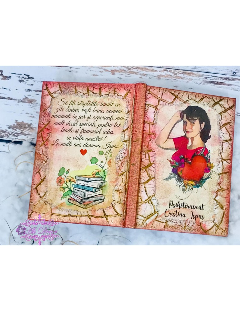 Explorează colecția noastră de cadouri personalizate handmade, create special pentru doamnele din sistemul medical. De la obiecte decorative lucrate manual până la accesorii unice personalizate, fiecare cadou este gândit să reflecte rafinament, profesionalism și recunoștință. Fiecare piesă este realizată cu atenție la detalii și materiale de calitate, fiind alegerea perfectă pentru a celebra eforturile și dedicația medicilor și asistentelor. Surprinde-le cu daruri originale, potrivite pentru orice ocazie, inclusiv 1 și 8 Martie. Vor aduce zambete acolo unde vor fi daruite. Alege sa oferi un cadou unic, care odata ce este personalizat devine un cadou cu totul special. Agendele sunt infrumusetate prin tehnica decoupage-ului si tehnici complementare, cu hartie de matase de cea mai mica densitate (12g), vopsele acrilice si lacuri pe baza de apa, non-toxice (Voc Low si Apeo Free), marca Maxi Decor. Pentru un efect vintage sunt antichizate cu lac de crapare si patine, oferindu-le un farmec aparte. Pe baza specificatiilor lasate de tine, ne rezervam dreptul sa ajustam grafica astfel incat tu sa primesti un produs unic. Daca doresti o tema care nu este disponibila, ne-o poti comunica - lasa-ti ideile in mainile noastre si nu vei regreta. Asigura-te ca ai completat toate detaliile necesare pentru a putea plasa comanda. Verificati ca mesajele sa fie scrise corect si cu diacritice, daca asa va doriti sa apara. Vom folosi intocmai textele trimise de dvs. Culorile pot diferi fata de varianta reala, in functie de setarile monitorului / device-ului dvs., luminozitate, contrast, culoare.