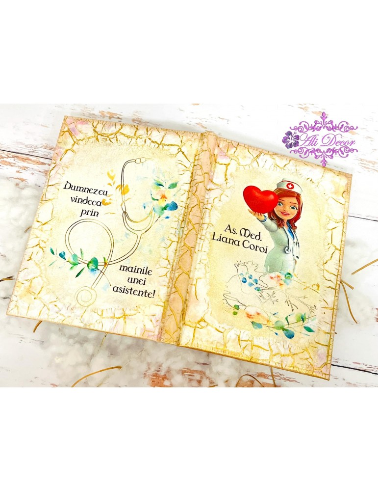 Explorează colecția noastră de cadouri personalizate handmade, create special pentru doamnele din sistemul medical. De la obiecte decorative lucrate manual până la accesorii unice personalizate, fiecare cadou este gândit să reflecte rafinament, profesionalism și recunoștință. Fiecare piesă este realizată cu atenție la detalii și materiale de calitate, fiind alegerea perfectă pentru a celebra eforturile și dedicația medicilor și asistentelor. Surprinde-le cu daruri originale, potrivite pentru orice ocazie, inclusiv 1 și 8 Martie. Vor aduce zambete acolo unde vor fi daruite. Alege sa oferi un cadou unic, care odata ce este personalizat devine un cadou cu totul special. Agendele sunt infrumusetate prin tehnica decoupage-ului si tehnici complementare, cu hartie de matase de cea mai mica densitate (12g), vopsele acrilice si lacuri pe baza de apa, non-toxice (Voc Low si Apeo Free), marca Maxi Decor. Pentru un efect vintage sunt antichizate cu lac de crapare si patine, oferindu-le un farmec aparte. Pe baza specificatiilor lasate de tine, ne rezervam dreptul sa ajustam grafica astfel incat tu sa primesti un produs unic. Daca doresti o tema care nu este disponibila, ne-o poti comunica - lasa-ti ideile in mainile noastre si nu vei regreta. Asigura-te ca ai completat toate detaliile necesare pentru a putea plasa comanda. Verificati ca mesajele sa fie scrise corect si cu diacritice, daca asa va doriti sa apara. Vom folosi intocmai textele trimise de dvs. Culorile pot diferi fata de varianta reala, in functie de setarile monitorului / device-ului dvs., luminozitate, contrast, culoare.