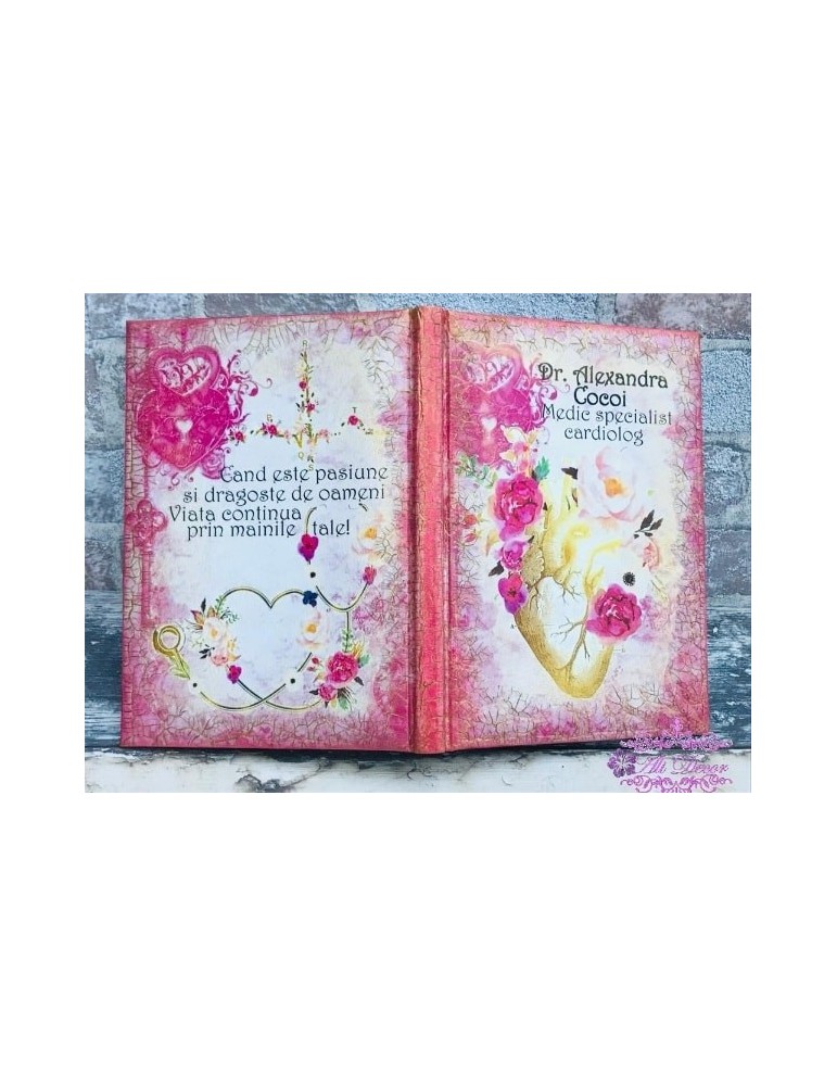 Explorează colecția noastră de cadouri personalizate handmade, create special pentru doamnele din sistemul medical. De la obiecte decorative lucrate manual până la accesorii unice personalizate, fiecare cadou este gândit să reflecte rafinament, profesionalism și recunoștință. Fiecare piesă este realizată cu atenție la detalii și materiale de calitate, fiind alegerea perfectă pentru a celebra eforturile și dedicația medicilor și asistentelor. Surprinde-le cu daruri originale, potrivite pentru orice ocazie, inclusiv 1 și 8 Martie. Vor aduce zambete acolo unde vor fi daruite. Alege sa oferi un cadou unic, care odata ce este personalizat devine un cadou cu totul special. Agendele sunt infrumusetate prin tehnica decoupage-ului si tehnici complementare, cu hartie de matase de cea mai mica densitate (12g), vopsele acrilice si lacuri pe baza de apa, non-toxice (Voc Low si Apeo Free), marca Maxi Decor. Pentru un efect vintage sunt antichizate cu lac de crapare si patine, oferindu-le un farmec aparte. Pe baza specificatiilor lasate de tine, ne rezervam dreptul sa ajustam grafica astfel incat tu sa primesti un produs unic. Daca doresti o tema care nu este disponibila, ne-o poti comunica - lasa-ti ideile in mainile noastre si nu vei regreta. Asigura-te ca ai completat toate detaliile necesare pentru a putea plasa comanda. Verificati ca mesajele sa fie scrise corect si cu diacritice, daca asa va doriti sa apara. Vom folosi intocmai textele trimise de dvs. Culorile pot diferi fata de varianta reala, in functie de setarile monitorului / device-ului dvs., luminozitate, contrast, culoare.