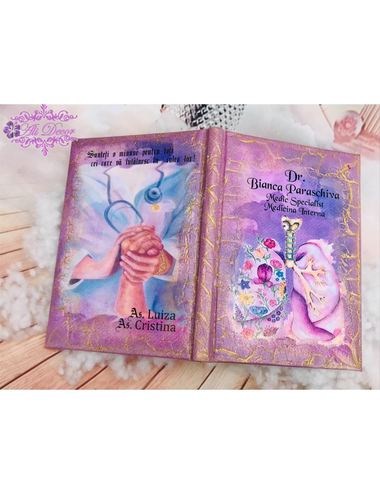 Explorează colecția noastră de cadouri personalizate handmade, create special pentru doamnele din sistemul medical. De la obiecte decorative lucrate manual până la accesorii unice personalizate, fiecare cadou este gândit să reflecte rafinament, profesionalism și recunoștință. Fiecare piesă este realizată cu atenție la detalii și materiale de calitate, fiind alegerea perfectă pentru a celebra eforturile și dedicația medicilor și asistentelor. Surprinde-le cu daruri originale, potrivite pentru orice ocazie, inclusiv 1 și 8 Martie. Vor aduce zambete acolo unde vor fi daruite. Alege sa oferi un cadou unic, care odata ce este personalizat devine un cadou cu totul special. Agendele sunt infrumusetate prin tehnica decoupage-ului si tehnici complementare, cu hartie de matase de cea mai mica densitate (12g), vopsele acrilice si lacuri pe baza de apa, non-toxice (Voc Low si Apeo Free), marca Maxi Decor. Pentru un efect vintage sunt antichizate cu lac de crapare si patine, oferindu-le un farmec aparte. Pe baza specificatiilor lasate de tine, ne rezervam dreptul sa ajustam grafica astfel incat tu sa primesti un produs unic. Daca doresti o tema care nu este disponibila, ne-o poti comunica - lasa-ti ideile in mainile noastre si nu vei regreta. Asigura-te ca ai completat toate detaliile necesare pentru a putea plasa comanda. Verificati ca mesajele sa fie scrise corect si cu diacritice, daca asa va doriti sa apara. Vom folosi intocmai textele trimise de dvs. Culorile pot diferi fata de varianta reala, in functie de setarile monitorului / device-ului dvs., luminozitate, contrast, culoare.