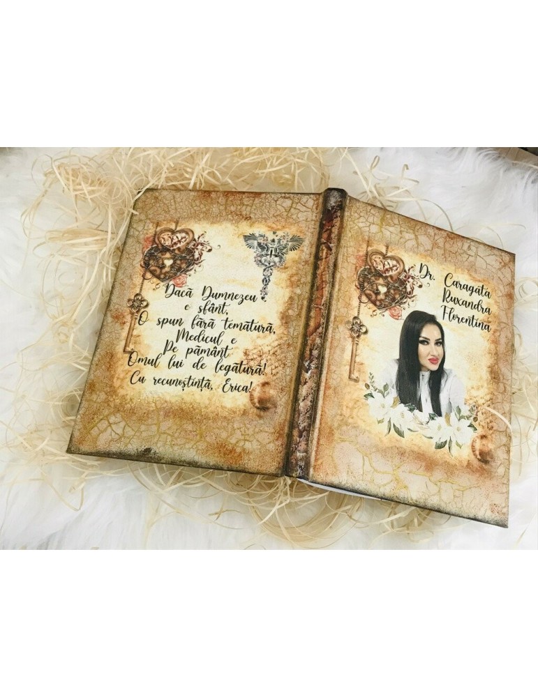 Explorează colecția noastră de cadouri personalizate handmade, create special pentru doamnele din sistemul medical. De la obiecte decorative lucrate manual până la accesorii unice personalizate, fiecare cadou este gândit să reflecte rafinament, profesionalism și recunoștință. Fiecare piesă este realizată cu atenție la detalii și materiale de calitate, fiind alegerea perfectă pentru a celebra eforturile și dedicația medicilor și asistentelor. Surprinde-le cu daruri originale, potrivite pentru orice ocazie, inclusiv 1 și 8 Martie. Vor aduce zambete acolo unde vor fi daruite. Alege sa oferi un cadou unic, care odata ce este personalizat devine un cadou cu totul special. Agendele sunt infrumusetate prin tehnica decoupage-ului si tehnici complementare, cu hartie de matase de cea mai mica densitate (12g), vopsele acrilice si lacuri pe baza de apa, non-toxice (Voc Low si Apeo Free), marca Maxi Decor. Pentru un efect vintage sunt antichizate cu lac de crapare si patine, oferindu-le un farmec aparte. Pe baza specificatiilor lasate de tine, ne rezervam dreptul sa ajustam grafica astfel incat tu sa primesti un produs unic. Daca doresti o tema care nu este disponibila, ne-o poti comunica - lasa-ti ideile in mainile noastre si nu vei regreta. Asigura-te ca ai completat toate detaliile necesare pentru a putea plasa comanda. Verificati ca mesajele sa fie scrise corect si cu diacritice, daca asa va doriti sa apara. Vom folosi intocmai textele trimise de dvs. Culorile pot diferi fata de varianta reala, in functie de setarile monitorului / device-ului dvs., luminozitate, contrast, culoare.