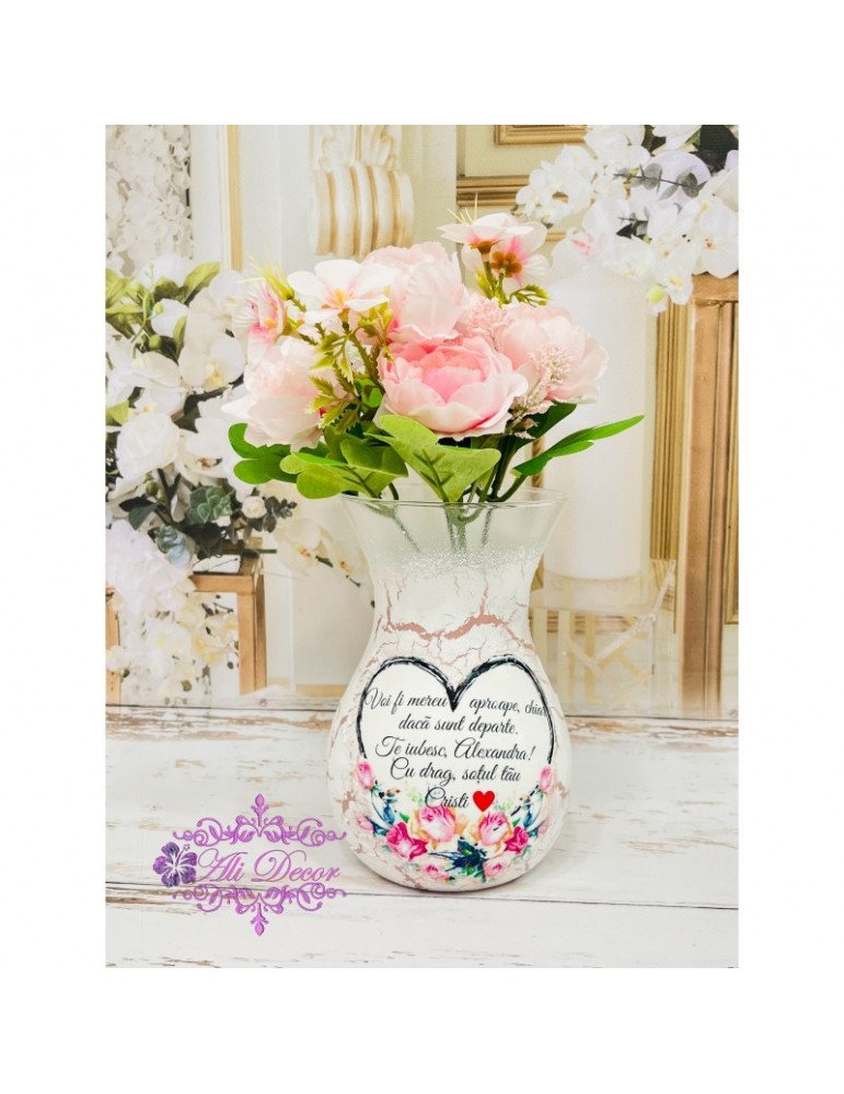 Răsfață-ți mama cu cadouri personalizate handmade, create cu grijă și iubire pentru a celebra momentele speciale.Fiecare obiect este atent gândit pentru a transmite emoție și recunoștință. Surprinde-ti mama cu daruri de suflet, care să-i aducă bucurie și să-i arate cât de mult o apreciezi.Flori, fete si baieti...in alegerea unui buchet de flori, alegerea iti apartine. Dar ce ar fi daca atunci cand daruiesti un buchet de flori ai oferi si o vaza personalizata? Surpiza va fi dubla in acesta caz :) Este infrumusetata prin tehnica decoupage-ului,cu hartie de matase de cea mai mica densitate (12g), vopsita si decorata manual, antichizata cu lac de crapare si patine, protejata cu lac pentru o rezistenta foarte buna in timp. Produsele folosite pentru decorare sunt produse profesionale,pe baza de apa, baby-friendly, certificate ecologic, non-Toxice, marca Maxi Decor (Voc Low & Apeo Free). Este accesorizata cu foita de aur pentru pictura. Pe baza specificatiilor lasate de tine, ne rezervam dreptul sa ajustam grafica astfel incat tu sa primesti un produs unic. Vaza este din sticla si se recomanda manipularea cu grija pentru a nu se sparge sau deteriora. Daca doresti o tema care nu este disponibila, ne-o poti comunica - lasa-ti ideile in mainile noastre si nu vei regreta. Asigura-te ca ai completat toate detaliile necesare pentru a putea plasa comanda. Verificati ca mesajele sa fie scrise corect si cu diacritice, daca asa va doriti sa apara. Vom folosi intocmai textele trimise de dvs. Culorile pot diferi fata de varianta reala, in functie de setarile monitorului / device-ului dvs., luminozitate, contrast, culoare. Forma vazei poate diferi in functie de stocul disponibil la furnizor.