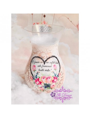 Descoperă cadourile personalizate handmade pentru soții și partenere, perfecte pentru a celebra momente speciale. Fiecare cadou este realizat manual cu atenție la detalii, pentru a reflecta unicitatea și afecțiunea din relația voastră. Surprinde persoana iubită cu daruri unice, create pentru a aduce bucurie și a transforma fiecare moment într-o amintire prețioasă. Flori, fete si baieti...in alegerea unui buchet de flori, alegerea iti apartine. Dar ce ar fi daca atunci cand daruiesti un buchet de flori ai oferi si o vaza personalizata? Surpiza va fi dubla in acesta caz :) Este infrumusetata prin tehnica decoupage-ului,cu hartie de matase de cea mai mica densitate (12g), vopsita si decorata manual, antichizata cu lac de crapare si patine, accesorizata cu elemente 3D, protejata cu lac pentru o rezistenta foarte buna in timp. Produsele folosite pentru decorare sunt produse profesionale,pe baza de apa, baby-friendly, certificate ecologic, non-Toxice, marca Maxi Decor (Voc Low & Apeo Free). Pe baza specificatiilor lasate de tine, ne rezervam dreptul sa ajustam grafica astfel incat tu sa primesti un produs unic. Vaza este din sticla si se recomanda manipularea cu grija pentru a nu se sparge sau deteriora. Daca doresti o tema care nu este disponibila, ne-o poti comunica - lasa-ti ideile in mainile noastre si nu vei regreta. Asigura-te ca ai completat toate detaliile necesare pentru a putea plasa comanda. Verificati ca mesajele sa fie scrise corect si cu diacritice, daca asa va doriti sa apara. Vom folosi intocmai textele trimise de dvs. Culorile pot diferi fata de varianta reala, in functie de setarile monitorului / device-ului dvs., luminozitate, contrast, culoare. Forma vazei poate diferi in functie de stocul disponibil la furnizor.