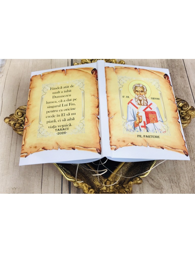Agenda personalizată nedatată reprezintă un produs decorativ și funcțional, conceput pentru a deveni un obiect de uz zilnic, dar și o piesă cu valoare simbolică. Coperta este elaborată în tonuri calde, cu efect de pergament antichizat, pe care se regăsesc două elemente centrale: imaginea Sfântului Ierarh Partenie, redată în stil iconografic clasic, și un text religios imprimat într-un cadru ornamental cu accente aurii. Împreună, acestea conferă produsului o identitate vizuală echilibrată și un caracter spiritual distinct.