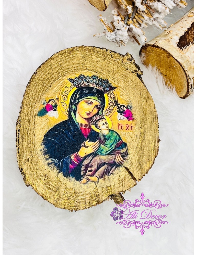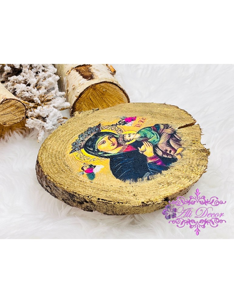 Fiecare icoană spune o poveste. Lasă ca a ta să aducă liniște, frumusețe și spiritualitate în casa ta. Forma feliei de lemn poate fi diferita. Icoana va avea agatatoare pe spate, dar include si un suport pe care poate fi asezata, fara a gauri peretele. Icoana nu este sfintita, lasandu-i oportunitatea celu/celei ce o va primi, sa o sfinteasca in locul lui/ei de suflet.