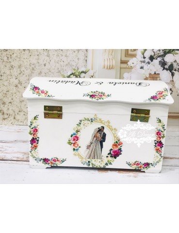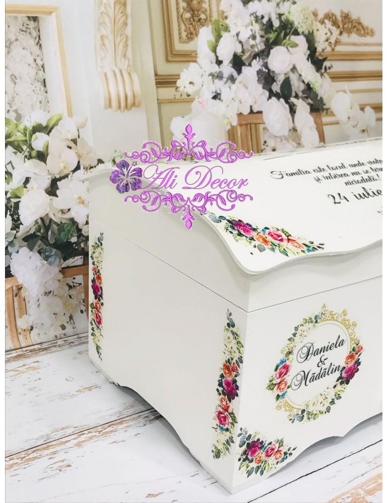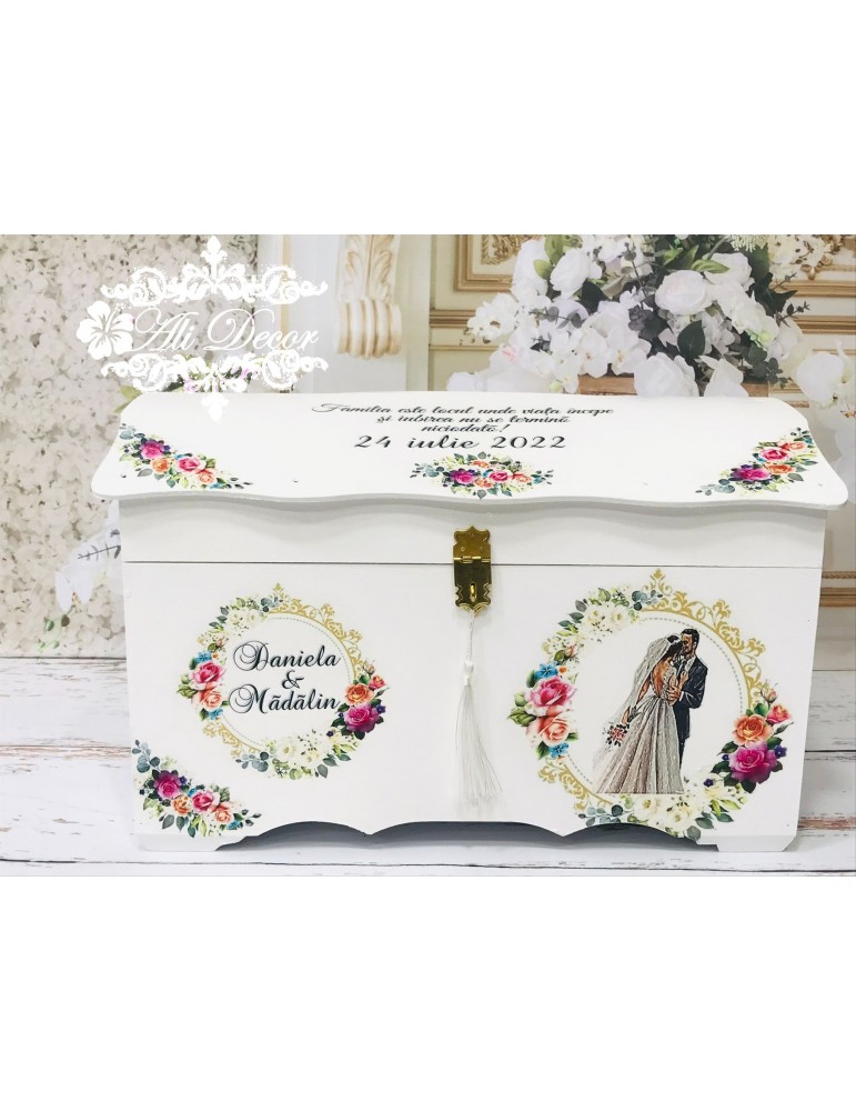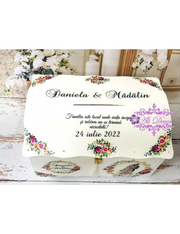 Cutia de dar pentru nunta - in ea strangi "bazele unei temelii', nu-i asa? Ulterior,poti pastra in ea amintirile celei mai importante zi din viata ta: buchetul de flori,jarteaua, albumul de poze...etc... Este din MDF, calitate superioara, are un aspect elegant, este decorata prin tehnica decoupage-ului, lucrata si vopsita cu produse profesionale NON-TOXICE, marca Maxi Decor. E protejat cu lac pe baza de apa, ce ii ofera rezistenta o viata :) Are rol multiplu:cutie de dar, iar ulterior o poti transforma in cutie de amintiri in care sa pastrezi cu drag obiectele ce-ti vor aduce aminte de cea mai frumoasa zi. Pe baza specificatiilor lasate de tine, ne rezervam dreptul sa ajustam grafica astfel incat tu sa primesti un produs unic. Daca doresti o tema care nu este disponibila, ne-o poti comunica - lasa-ti ideile in mainile noastre si nu vei regreta. Asigura-te ca ai completat toate detaliile necesare pentru a putea plasa comanda. Verificati ca mesajele sa fie scrise corect si cu diacritice, daca asa va doriti sa apara. Vom folosi intocmai textele trimise de dvs. Culorile pot diferi fata de varianta reala, in functie de setarile monitorului / device-ului dvs., luminozitate, contrast, culoare. Accesoriile pot sa difere, in functie de stocul disponibil la furnizor.