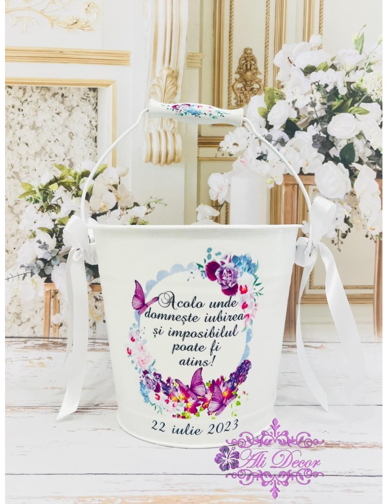 În tradiția românească a nunții, „udatul” este unul dintre cele mai frumoase obiceiuri, plin de simboluri și emoții. Mireasa, însoțită de alai, merge spre fântână pentru a lua apă, iar găleata decorată și personalizată devine elementul central al ritualului. Cu busuioc, fir tricolor și apă proaspătă, gestul stropirii aduce urări de belșug, sănătate și viață îmbelșugată pentru tinerii căsătoriți. La AliDecor, fiecare găleată a miresei personalizată este decorată manual cu tehnica decoupage-ului, vopsele pe bază de apă și lac protector non-toxic, pentru rezistență și frumusețe în timp. Poate fi personalizată cu numele mirilor, data nunții sau simboluri tradiționale care dau unicitate evenimentului vostru.