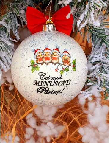 Daca esti pe ultima suta de metri si nu ai reusit sa cumperi cadouri pentru toti cei dragi, venim in intampinarea ta cu acest model de glob, potrivit pentru parinti. Aceste globuri sunt perfecte pentru a aduce zâmbete în casa ta sau pentru a oferi un cadou unic și memorabil celor dragi, cadou ce va starni zambete in fiecare an. Ambalarea cadou si fundita asortata globului sunt din partea noastra, tie iti va ramane doar sa-l daruiesti cui vei dori!:) Globul este personalizat fata-verso prin tehnica decoupage, vopsit manual cu produse acrilice, non-toxice, profesionale, marca Maxi Decor. Este protejat cu lac pentru o buna rezistenta in timp. Culorile pot diferi fata de varianta reala, in functie de setarile monitorului / device-ului dvs, luminozitate, contrast, culoare. Pretul este pentru un singur glob. Accesoriile pot sa difere, in functie de stocul disponibil la furnizor. Acest glob nu poate suporta modificari.