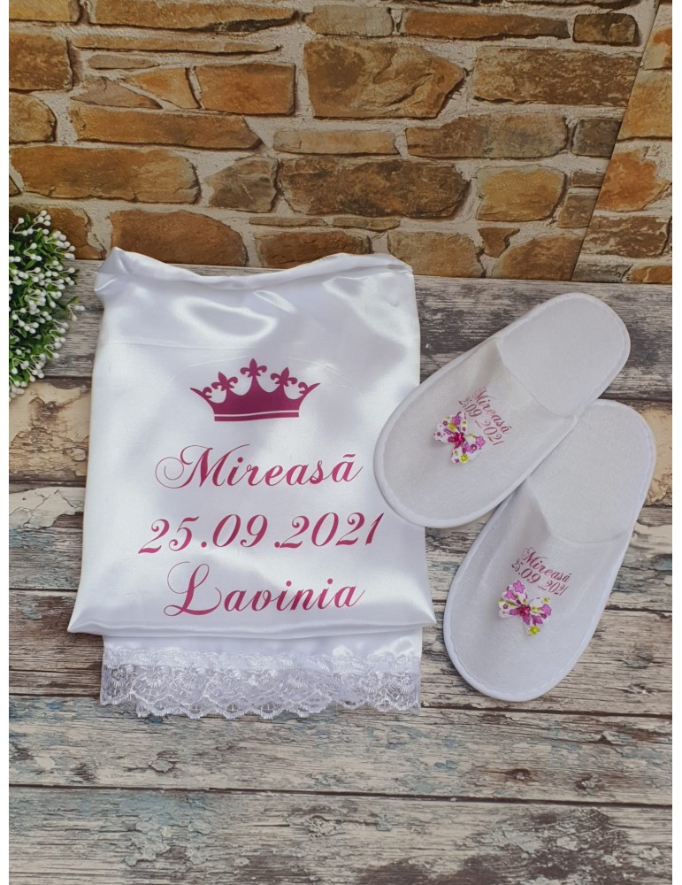 Nunta este unul dintre cele mai importante momente, iar pregatirile fac parte din eveniment. Iti oferim un halat din saten cu dantela, care nu doar ca este comod si potrivit, dar in acelasi timp arata superb si te vei simti extraordinar in el si papuceii personalizati, iar pozele tale vor fi unice! Se personalizeaza prin imprimare, exact asa cum iti doresti! Pretul afisat este pentru setul format din halat si papucei personalizati.