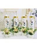 Fiecare lumânare poate fi personalizată cu numele mirilor, data nunții sau simboluri care vă definesc, fiind realizată manual cu atenție, accesorizate cu perlute, pietricele delicate si foita aurie pentru pictura,folosind materiale profesionale sigure. Fiecare piesă este finisată cu grijă, astfel încât să reziste și să păstreze eleganța și rafinamentul în timp. Florile folosite pentru decorare sunt flori artificiale, real-touch, de calitate superioara. Puteti alege in ce culori sa fie decorate, vom tine cont de asta, dar florile si accesoriile pot sa difere in functie de stocul disponibil la furnizor. Modul de aranjare al florilor poate diferi in functie de detaliile personalizarii.