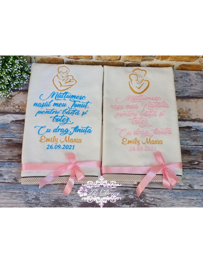 Botezul este o zi unică și specială din viața fiecăruia, iar toate detaliile sunt importante și tratate cu multă atenție. Daca esti in cautare de cadouri pentru nasi sau alte persoane dragi din viata ta, iti propunem un set de prosoape calitate premium, personalizate prin broderie in tematica dorita. Broderia este cea mai rezistenta metoda de personalizare, cusaturile au o viata indelungata in timp si nu se decoloreaza in urma spalarilor, deoarece folosim materiale profesionale speciale pentru broderie, Madeira. Pretul afisat este pentru un singur prosop si poti alege dimensiunea lui. Se poate realiza in orice tematica doresti. Daca doresti o tema care nu este disponibila, ne-o poti comunica- iti vom arata modelele disponibile de broderie pentru tema aleasa - lasa-ti ideile in mainile noastre si nu vei regreta. Asigura-te ca ai completat toate detaliile necesare pentru a putea plasa comanda. Verificati ca mesajele sa fie scrise corect si cu diacritice, daca asa va doriti sa apara. Vom folosi intocmai textele trimise de dvs. Culorile pot diferi fata de varianta reala, in functie de setarile monitorului / device-ului dvs., luminozitate, contrast, culoare. Modelul prosopului poate sa difere in functie de stocul disponibil la furnizor. Ambalarea in cutie cadou este din partea noastra.