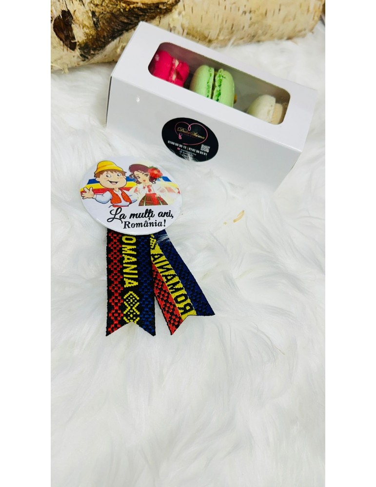 Cadou special de 1 Decembrie, format dintr-o insignă personalizată cu motive tradiționale și 3 macarons delicioase. Oferă un dar simbolic și dulce pentru a celebra Ziua Națională într-un mod elegant și autentic!