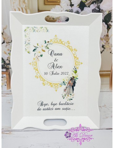 Barbieritul mirelui este unul dintre cele mai vechi obiceiuri ale unei nunti. In zilele noastre acest obicei se mai pastreaza inca pe la sate si in orasele mai mici. Barbieritul mirelui este de fapt un gest simbolic ce marcheaza trecerea de la statutul de flacau la cel de barbat la casa lui. Barbatul insurat, acum cap de familie, devine astfel un membru cu drepturi depline in societate. Nicio poveste nu poate fi completa fara accesoriile potrivite - ele pot face diferenta si iti vor oferi amintiri de neuitat. Iti punem la dispozitie pentru desfasurarea acestei traditii tava personalizata pentru gatitul mirelui, satar si pamatuf pentru obiceiul de barberit. Acestea sunt infrumusețate prin tehnica decoupage-ului și pictate cu vopsele acrilice non-toxice,marca Maxi Decor, apoi lăcuite pentru o rezistenta buna in timp. Se poate realiza in orice tematica doresti.. Daca doresti o tema care nu este disponibila, ne-o poti comunica - lasa-ti ideile in mainile noastre si nu vei regreta.. Pe baza specificatiilor lasate de tine, ne rezervam dreptul sa ajustam grafica astfel incat tu sa primesti un produs unic. Asigura-te ca ai completat toate detaliile necesare pentru a putea plasa comanda. Verificati ca mesajele sa fie scrise corect si cu diacritice, daca asa va doriti sa apara. Vom folosi intocmai textele trimise de dvs. Culorile pot diferi fata de varianta reala, in functie de setarile monitorului / device-ului dvs., luminozitate, contrast, culoare. Forma blank-urilor (a tavii si satarului) pot sa difere in functie de stocul disponibil la furnizor.