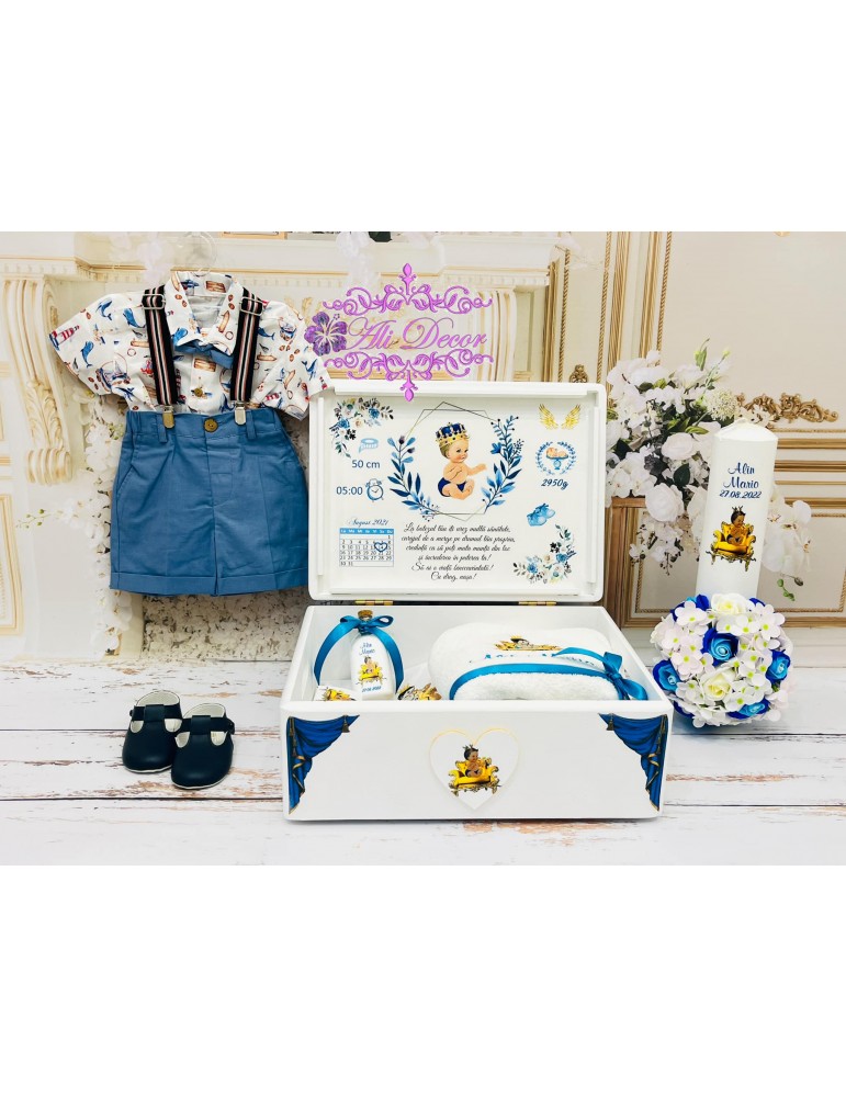 Seturi de botez complete, personalizate! ✨ Trusou brodat, lumânare asortată și, la alegere, carafă pentru botez, în funcție de tradițiile din zona ta. Ambalate elegant în cutie standard sau in cutie de lemn personalizata in tematica botezului, cu datele de la nastere, perfecte pentru o ceremonie de neuitat! Atentie, articolele de imbracaminte si incaltaminte nu sunt incluse.