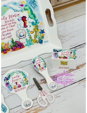 La fel ca toate evenimentele importante dintr-o familie, aniversarea de un an este incarcata de traditii si obiceiuri. Traditia tavitei, a setului de moț ramane cel mai asteptat moment al petrecerii, atunci cand micutul/micuta prin alegerea a trei obiecte de pe tava, isi arata posibilele lui inclinatii, aratandu-le parintilor care ar putea fi drumul spre care poate fi indrumat cel/cea mic/mica. Alege sa ai amintiri unice si opteaza pentru un set aniversar lucrat curat, plin de emotie - pentru ca emotiile tale sunt asternute de noi in creearea graficii perfecte. Acesta este din lemn si mdf, infrumusețat prin tehnica decoupage-ului și pictat cu vopsele acrilice non-toxice,marca Maxi Decor, apoi lăcuit pentru ca tu să te poți bucura de el ani la rând. Setul se personalizeaza cu numele, iar la alegere poate fi personalizat si cu un mesaj, cu data sau chiar si cu poza copilasului. Se poate realiza in orice tematica doresti. Nu uita sa completezi toate detaliile necesare personalizarii pentru a putea plasa comanda. Verificati ca mesajele sa fie scrise corect si cu diacritice, daca asa va doriti sa apara. Vom folosi intocmai textele trimise de dvs. Accesoriile si forma elementelor blank pot sa difere in functie de stocul disponibil la furnizor. Ne rezervam dreptul de a ajusta grafica in functie de cerintele dvs. Setul conține obiectele prezentate in poze: tavă, cutiuță în care să poți păstra prima șuviță a copilului, perie de păr, oglindă, forfecuță si ramă foto.