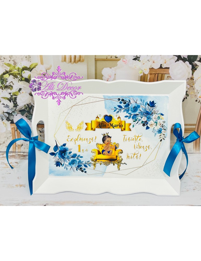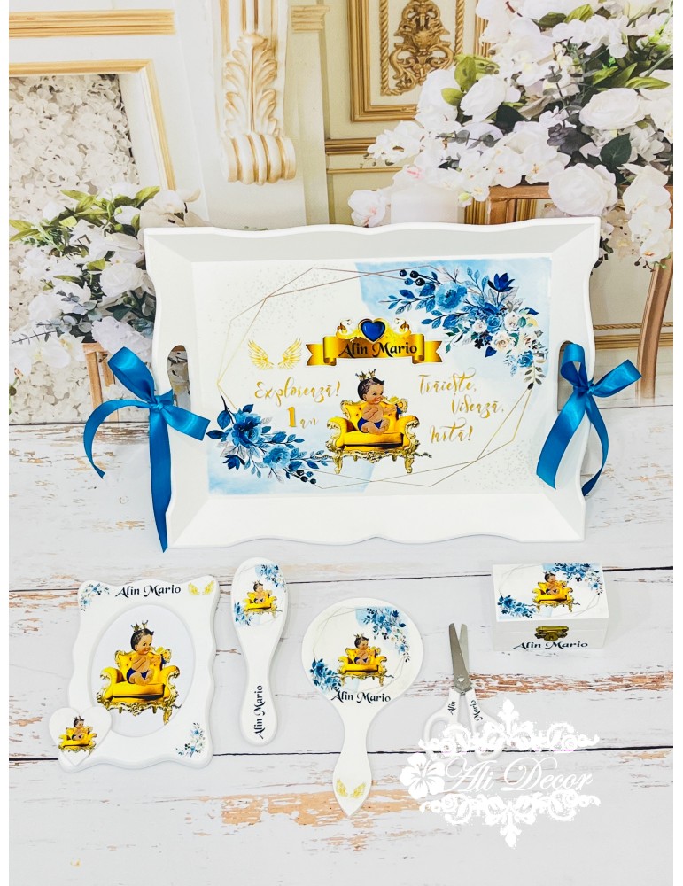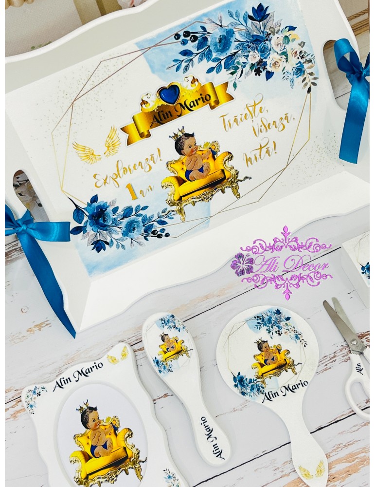 La fel ca toate evenimentele importante dintr-o familie, aniversarea de un an este incarcata de traditii si obiceiuri. Traditia tavitei, a setului de moț ramane cel mai asteptat moment al petrecerii, atunci cand micutul/micuta prin alegerea a trei obiecte de pe tava, isi arata posibilele lui inclinatii, aratandu-le parintilor care ar putea fi drumul spre care poate fi indrumat cel/cea mic/mica. Alege sa ai amintiri unice si opteaza pentru un set aniversar lucrat curat, plin de emotie - pentru ca emotiile tale sunt asternute de noi in creearea graficii perfecte. Acesta este din lemn si mdf, infrumusețat prin tehnica decoupage-ului și pictat cu vopsele acrilice non-toxice,marca Maxi Decor, apoi lăcuit pentru ca tu să te poți bucura de el ani la rând. Setul se personalizeaza cu numele, iar la alegere poate fi personalizat si cu un mesaj, cu data sau chiar si cu poza copilasului. Se poate realiza in orice tematica doresti. Nu uita sa completezi toate detaliile necesare personalizarii pentru a putea plasa comanda. Verificati ca mesajele sa fie scrise corect si cu diacritice, daca asa va doriti sa apara. Vom folosi intocmai textele trimise de dvs. Accesoriile si forma elementelor blank pot sa difere in functie de stocul disponibil la furnizor. Ne rezervam dreptul de a ajusta grafica in functie de cerintele dvs. Setul conține obiectele prezentate in poze: tavă, cutiuță în care să poți păstra prima șuviță a copilului, perie de păr, oglindă, forfecuță si ramă foto.