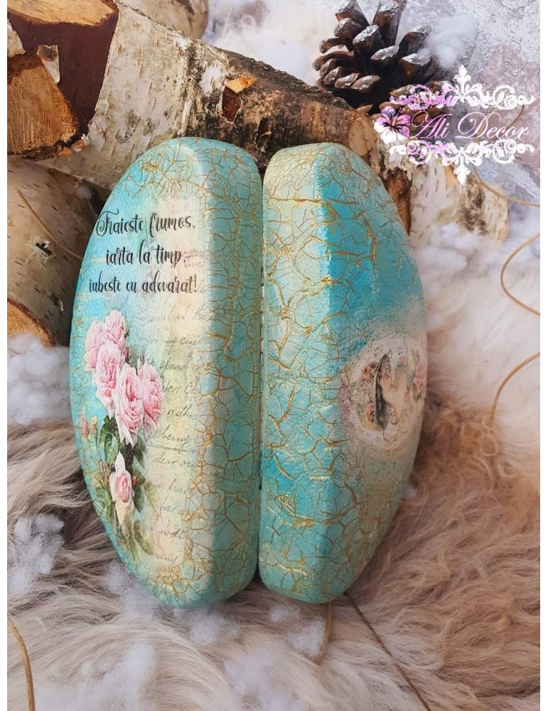 Fie că alegi un mesaj motivațional, un nume, o dedicație, o dată importantă sau un design grafic care te reprezintă, fiecare toc este decorat și personalizat manual cu grijă, folosind tehnica decoupage-ului și culori profesionale pe bază de apă, antichizate cu lac de crapare si patine. Totul este sigilat cu un lac non-toxic și durabil, pentru un finisaj elegant și rezistent.