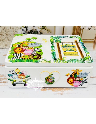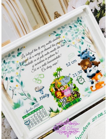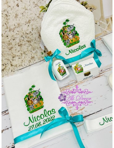 Trusoul de botez este esential pentru a transforma cel mai frumos moment din viata copilasului intr-un moment de neuitat, intr-o frumoasa poveste cu amintiri unice. Nu uita ca pozele sunt cele mai palpabile amintiri peste ani si ani. Toate detaliile sunt importante și tratate cu multă atenție. Daca esti in cautare de trusoul pentru botez, iti propunem un trusou cu prosoape de calitate premium, personalizat prin broderie in tematica dorita. Broderia este cea mai rezistenta metoda de personalizare, cusaturile au o viata indelungata in timp si nu se decoloreaza in urma spalarilor, deoarece folosim materiale profesionale speciale pentru broderie, Madeira. Cutia din lemn pentru trusou, cutiuta pentru prima suvita si sticluta pentru mir, sunt personalizate in ton cu tematica trusoului,prin tehnica decoupage-ului, vopsite manual si lacuite cu produse profesionale non-toxice, marca Maxi Decor. Cufarul personalizat pentru trusoul de botez - un cadou ideal ce isi dovedeste utilitatea in timp. Este un loc unde se strang laolalta amintiri, povesti, emotii - prima ecografie a copilasului din burtica mamei, prima jucarie, prima poza. Pastreaza-le in cufarul amintirilor si le vei revedea si retrai de fiecare data cand iti va fi dor - vor trezi emotie in sufletul tau. Setul de botez se personalizeaza in tematica dorita de tine. Daca doresti o tema care nu este disponibila, ne-o poti comunica (daca optati pentru o grafica noua, aceasta va va fi aratata in prealabil pentru a primi acordul dvs.) - lasa-ti ideile in mainile noastre si nu vei regreta. Asigura-te ca ai completat toate detaliile necesare pentru a putea plasa comanda. Verificati ca mesajele sa fie scrise corect si cu diacritice, daca asa va doriti sa apara. Vom folosi intocmai textele trimise de dvs. Culorile pot diferi fata de varianta reala, in functie de setarile monitorului / device-ului dvs., luminozitate, contrast, culoare. Accesoriile si forma cutiei pot sa difere usor, in functie de stocul disponibil la furnizor.