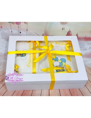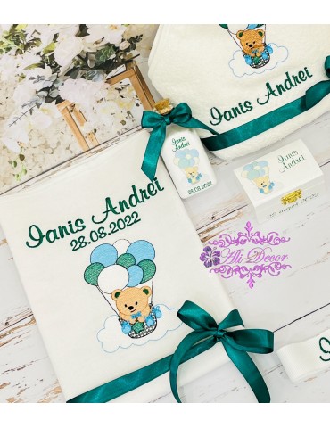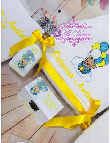 Trusoul de botez este esential pentru a transforma cel mai frumos moment din viata copilasului intr-un moment de neuitat, intr-o frumoasa poveste cu amintiri unice. Toate detaliile sunt importante și tratate cu multă atenție. Daca esti in cautare de trusoul pentru botez, iti propunem un trusou cu prosoape de calitate premium, personalizat prin broderie in tematica dorita. Broderia este cea mai rezistenta metoda de personalizare, cusaturile au o viata indelungata in timp si nu se decoloreaza in urma spalarilor, deoarece folosim materiale profesionale speciale pentru broderie, Madeira. Cutiuta pentru prima suvita si sticluta pentru mir, sunt personalizate in ton cu tematica trusoului,prin tehnica decoupage-ului, vopsite manual si lacuite cu produse profesionale non-toxice, marca Maxi Decor. Se poate realiza in orice tematica doresti. Daca doresti o tema care nu este disponibila, ne-o poti comunica- iti vom arata modelele disponibile de broderie pentru tema aleasa - lasa-ti ideile in mainile noastre si nu vei regreta. Asigura-te ca ai completat toate detaliile necesare pentru a putea plasa comanda. Verificati ca mesajele sa fie scrise corect si cu diacritice, daca asa va doriti sa apara. Vom folosi intocmai textele trimise de dvs .Accesoriile pot sa difere in functie de stocul disponibil la furnizor. Culorile pot diferi fata de varianta reala, in functie de setarile monitorului / device-ului dvs., luminozitate, contrast, culoare. Ambalarea in cutie cadou este din partea noastra.