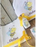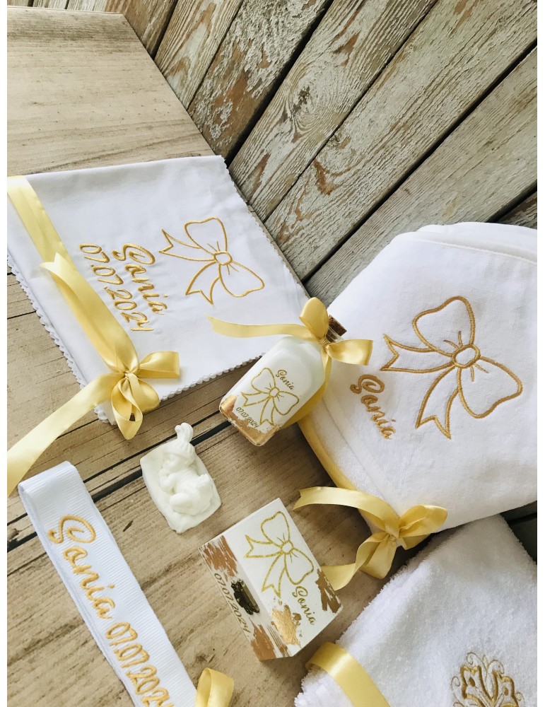 Trusoul de botez este esential pentru a transforma cel mai frumos moment din viata copilasului intr-un moment de neuitat, intr-o frumoasa poveste cu amintiri unice. Toate detaliile sunt importante și tratate cu multă atenție. Daca esti in cautare de trusoul pentru botez, iti propunem un trusou cu prosoape de calitate premium, personalizat prin broderie in tematica dorita. Broderia este cea mai rezistenta metoda de personalizare, cusaturile au o viata indelungata in timp si nu se decoloreaza in urma spalarilor, deoarece folosim materiale profesionale speciale pentru broderie, Madeira. Cutiuta pentru prima suvita si sticluta pentru mir, sunt personalizate in ton cu tematica trusoului,prin tehnica decoupage-ului, accesorizate cu foita de aur pentru pictura, vopsite manual si lacuite cu produse profesionale non-toxice, marca Maxi Decor, decorat cu foita de aur 8K. Se poate realiza in orice tematica doresti. Daca doresti o tema care nu este disponibila, ne-o poti comunica- iti vom arata modelele disponibile de broderie pentru tema aleasa - lasa-ti ideile in mainile noastre si nu vei regreta. Asigura-te ca ai completat toate detaliile necesare pentru a putea plasa comanda. Verificati ca mesajele sa fie scrise corect si cu diacritice, daca asa va doriti sa apara. Vom folosi intocmai textele trimise de dvs .Accesoriile pot sa difere in functie de stocul disponibil la furnizor. Culorile pot diferi fata de varianta reala, in functie de setarile monitorului / device-ului dvs., luminozitate, contrast, culoare. Ambalarea in cutie cadou este din partea noastra.