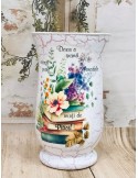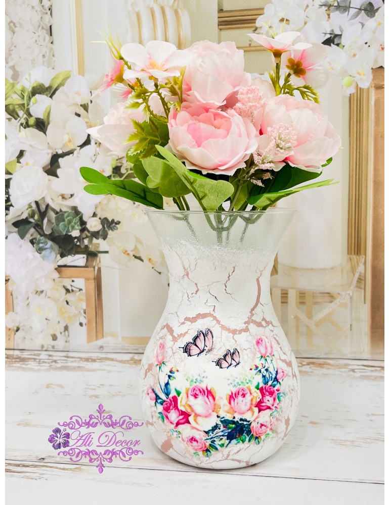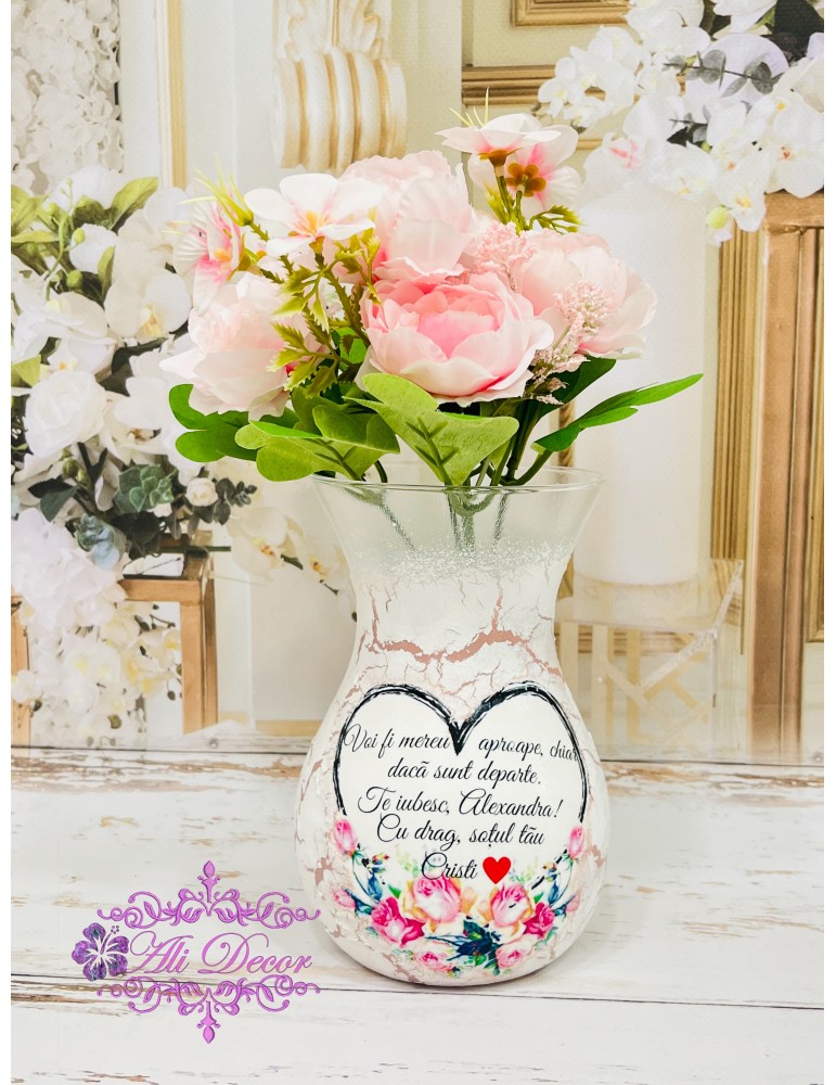 Decorate manual prin tehnica decoupage-ului, protejate cu lacuri profesionale non-toxice, fiecare vază devine unică. Poate fi personalizată cu numele persoanei dragi, o dată importantă sau un mesaj din inimă – toate redate cu delicatețe, pentru un efect de neuitat.