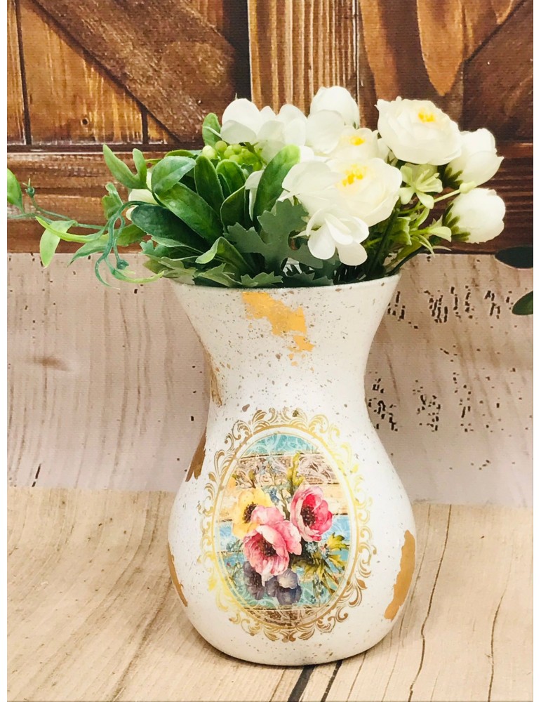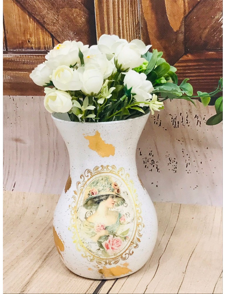 Decorate manual prin tehnica decoupage-ului, protejate cu lacuri profesionale non-toxice, accesorizata cu foita aurie pentru pictura, fiecare vază devine unică. Poate fi personalizată cu numele persoanei dragi, o dată importantă sau un mesaj din inimă – toate redate cu delicatețe, pentru un efect de neuitat.